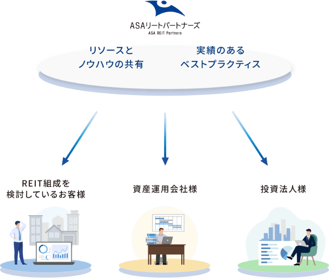 ASAリートパートナーズは、REIT業界におけるあらゆる分野に精通した経験豊富なメンバーを揃え、 そのリソースとノウハウを共有し、経験と実績から得られたベストプラクティスにより、資産運用会社様のビジネスをサポートする各種サービスを提供する業界ではユニークな会社です。