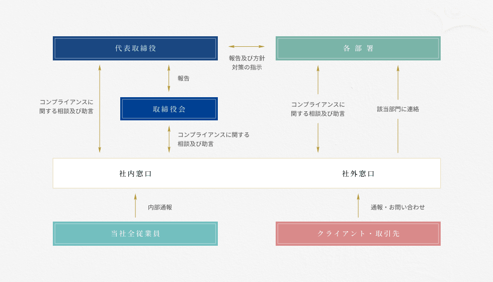 コンプライアンス上の問題点の早期発見、対処、発生防止等を目的として、全従業員からの内部通報・相談を受け付ける専門の窓口を設けています。