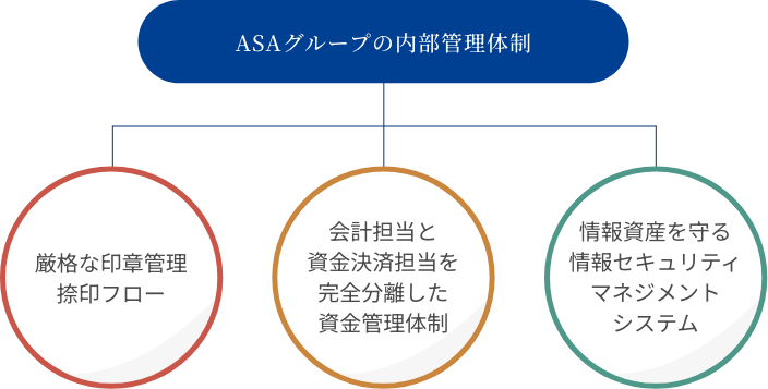 ASAグループでは、その社会的責任においてクライアントの不利益とならないよう、想定しうるリスクに起因する不正や誤りを未然に防止するための内部管理体制を構築しております。特に、印章管理及びキャッシュマネジメント業務については、社内規定やマニュアルに定めた厳格な承認手続きとアクセス制限に基づき、業務を遂行しております。