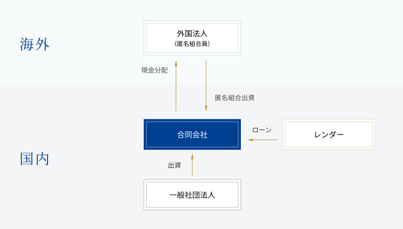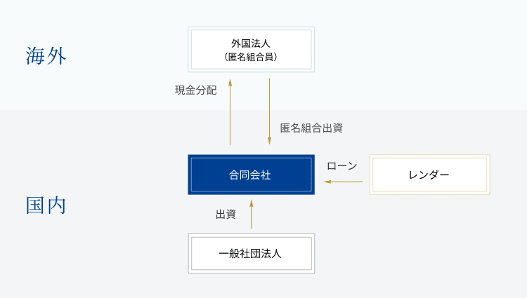 合同会社(GK)が商法上の匿名組合(TK)出資を受けることで、匿名組合事業の利益はその分配を通じてGKにおいて損金算入されるため、匿名組合員である外国法人は税引前の利益を享受できる(二重課税の回避)。