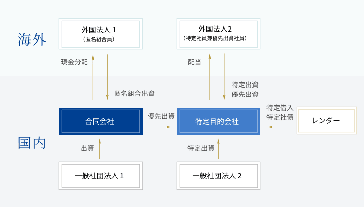 多くは合同会社(GK)に海外からの匿名組合(TK)出資を組み合わせるストラクチャー(GK-TK)、資産流動化法に基づき設立される特定目的会社(TMK)ストラクチャーとなり、TMKストラクチャーの場合は導管性要件により国内の優先出資者がGKもしくは外国法人の東京支店となるケースが多く見受けられます。当社の豊富な受託実績により、ストラクチャーのご相談から運営中の税務面など最適なソリューションをご提供致します。